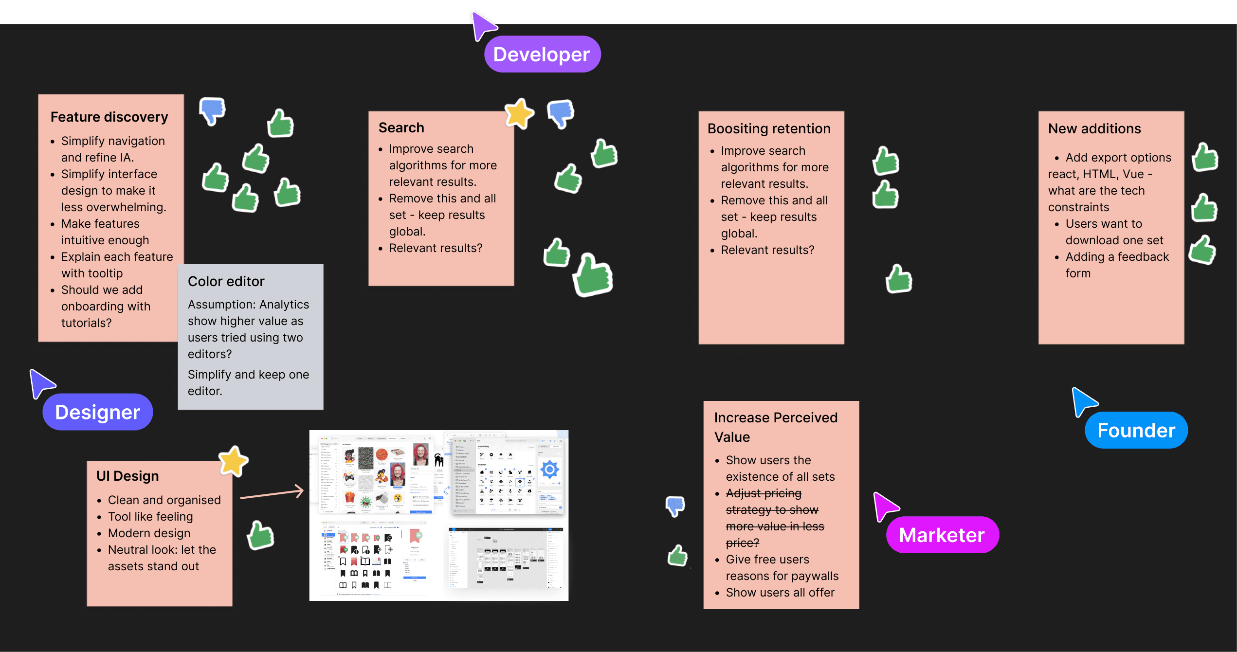 I facilitated a team session to review our research findings, where we thoroughly analyzed each pain point to collectively shape our approach moving forward. For each pain point cluster, we brainstormed and documented ideas to enhance the user experience.