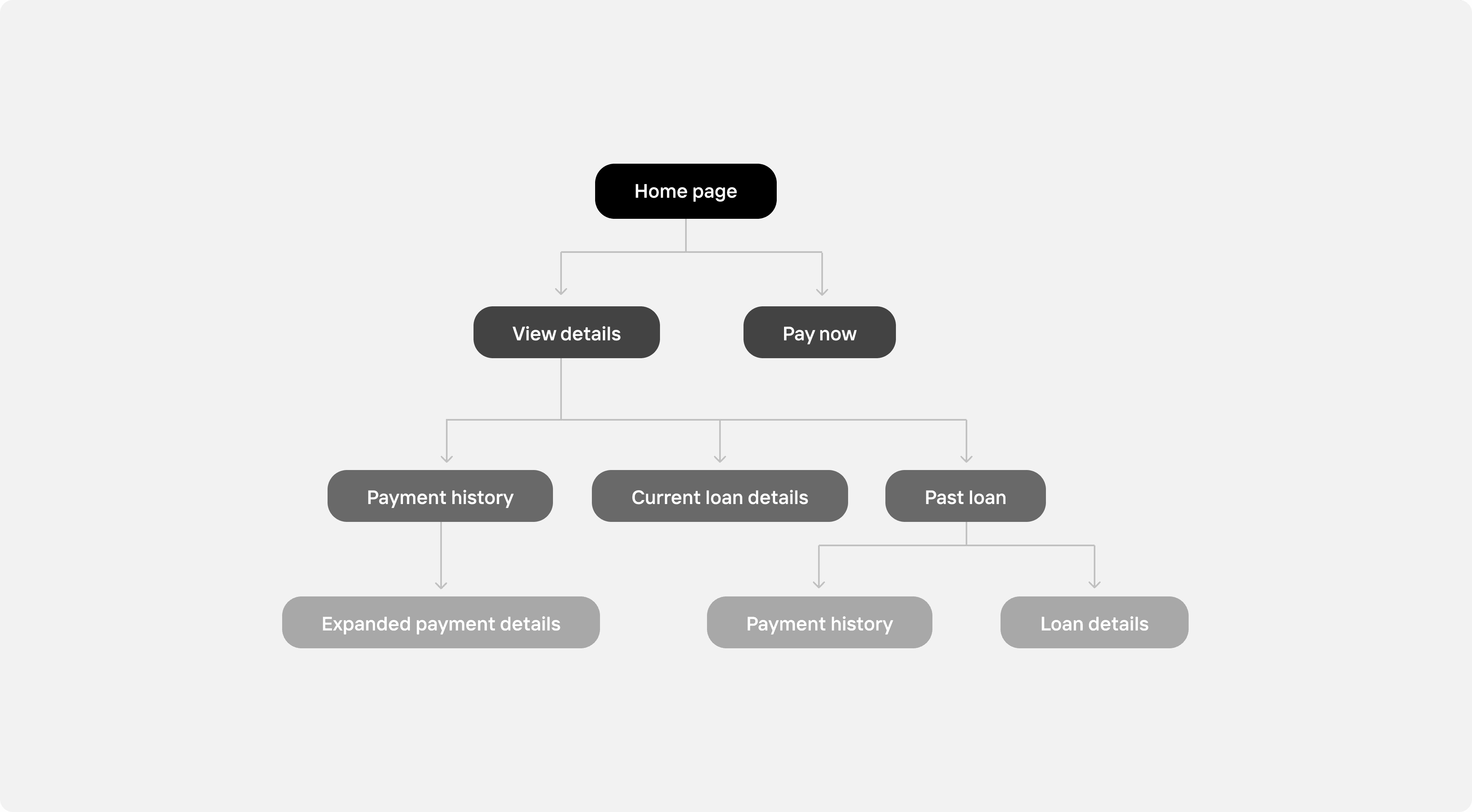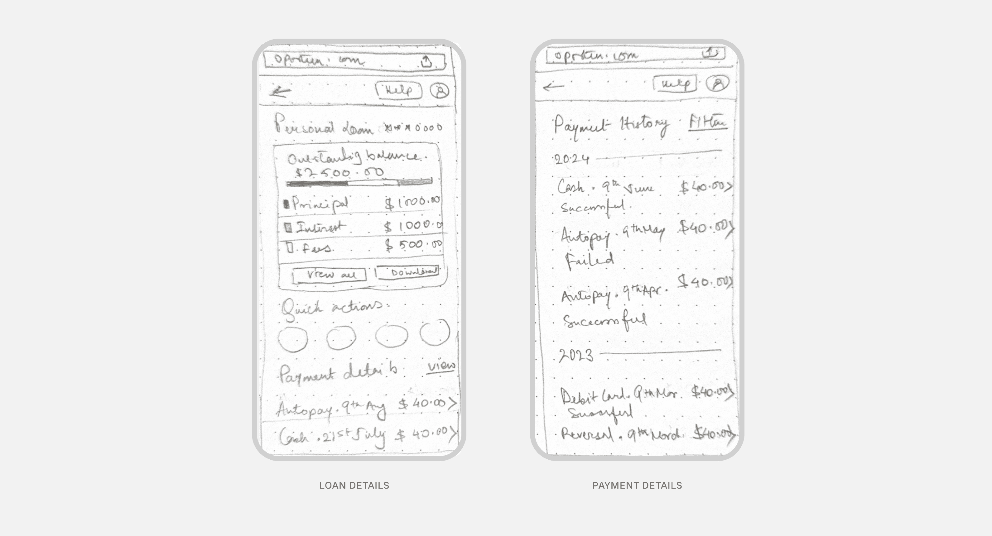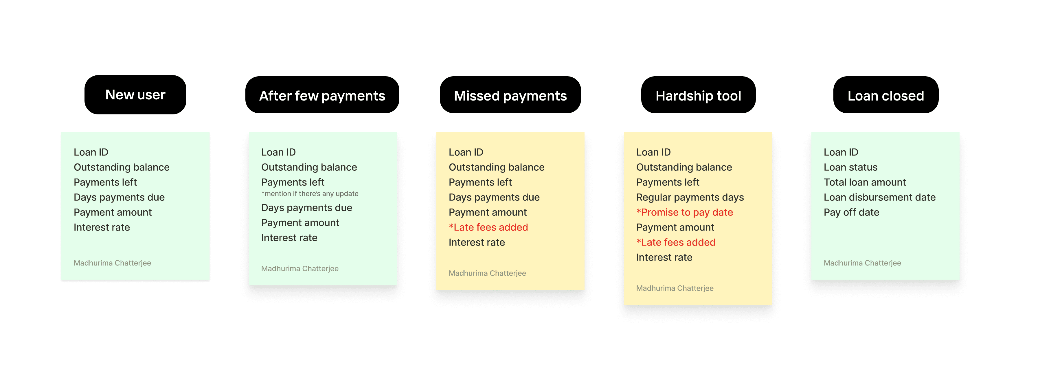 We mapped out the user journey from start to finish, considering all possible user states that could impact loan and payment details. We focused on identifying relevant information to display at a glance and how it would vary across different user states. For example, a member who has missed a payment would likely want to see if any late fees have been applied and how they are calculated.