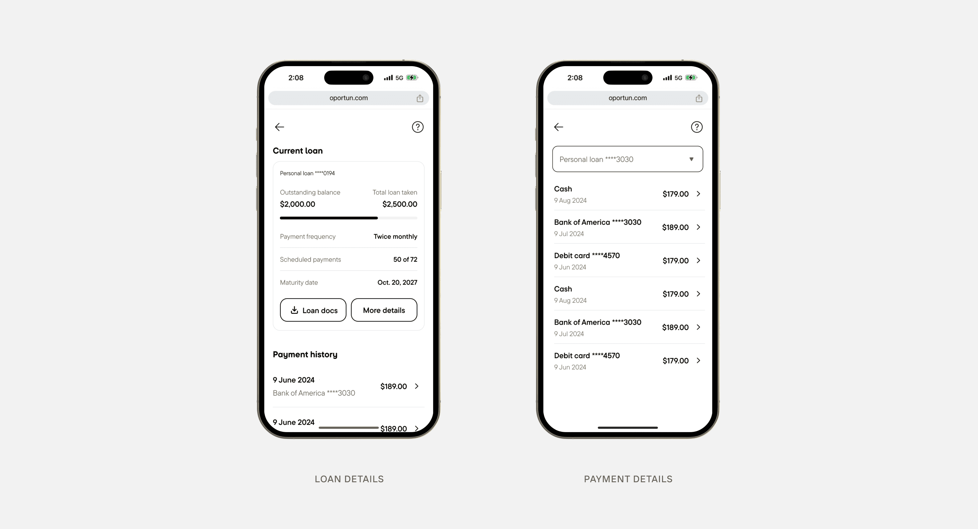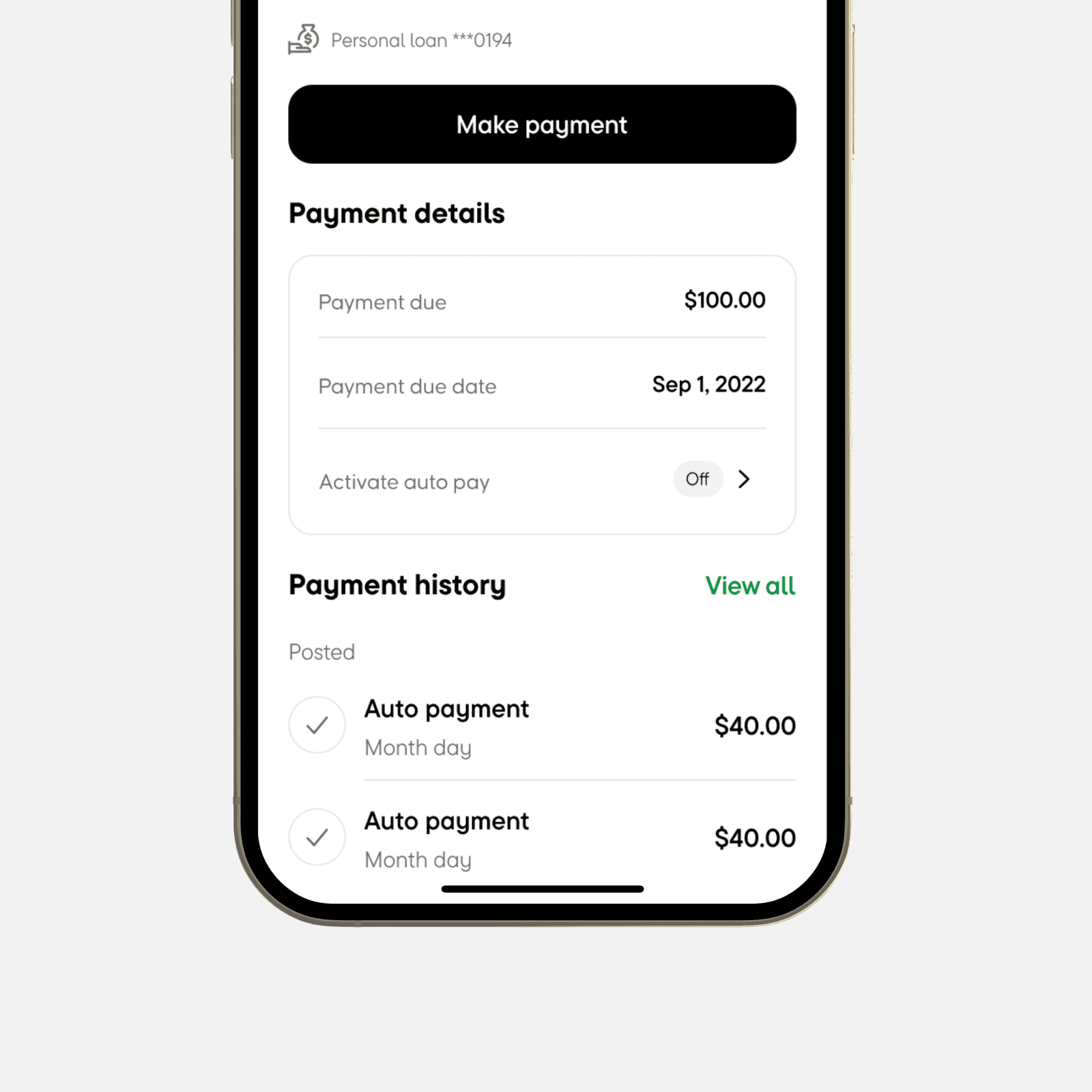 To begin, we designed a structure that aligned with our vision, providing the necessary details without overwhelming the user. Rather than clutter the home page with loan information, we placed it under a "View details" section. This section was designed to house all relevant information for both active and past loans, including various payment history states.